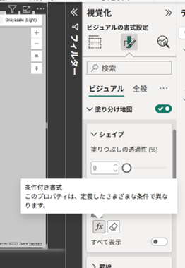 そこから、書式設定⇒塗分け地図を展開、色のメニュー部分のfxボタンを押します。