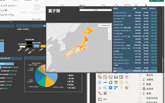 例えば、サマリーページからヒントとして詳細ページが表示されるように設定し、商品区分にマウスを当てると、その商品区分の全国の売上をグラデーションで確認することも可能です。