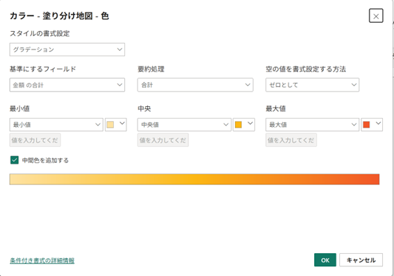 書式設定はこのように金額が少ないものから徐々に薄い黄色から濃いオレンジになるように設定します。