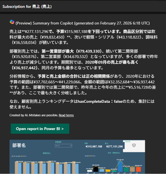 このようにレポートのキャプチャとリンク、更に上部にCopilotの概要が送られてきました。